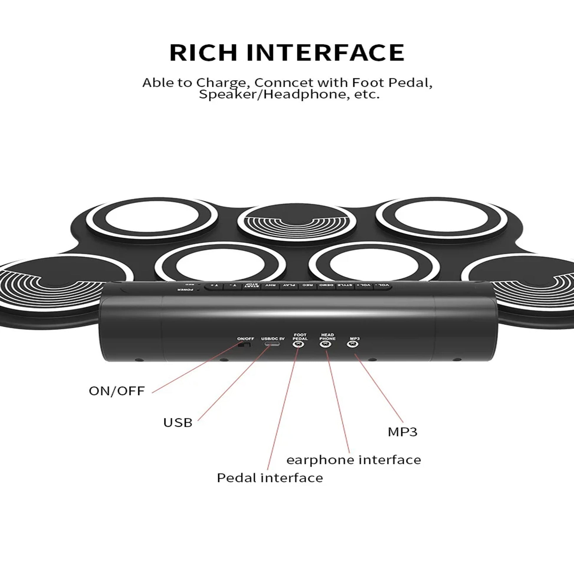 Connectivity Options for Seamless Integration: The electric drum pad offers various connectivity options, allowing seamless integration with other musical instruments, recording equipment, and sound systems for a complete musical setup.